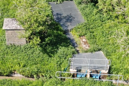 This is the business end of where a long pipe diverts untreated sewage from the pipe heading from Bourton to the sewage works, set outside town at Little Rissington on the River Dikler. The diversion uses a weir system, so when too much flow is incoming, the excess fluids go over the weir and head along a pipe to a field which was once a filter bed of rushes. It is now a series of ditches covered in shrubs and nettles and when they fill up, the sewage goes via another pipe to the river. This is the pipe.